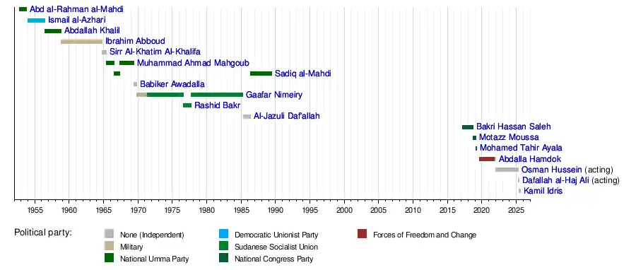 - ^ Briefly interrupted following the 2021 coup d'état, when Abdel Fattah al-Burhan served as head of state and there was no prime minister.