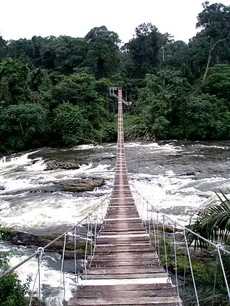 Campo Ma'an National Park covers an area of 264,064 hectare and was established in 2000.[2] The combined area for the national park and the buffer zone surrounding the park is approximately 700,000 hectares.[16] The Campo Wildlife Reserve established in 1932 and the Ma’an Production Reserve set up in 1980 were combined to form this park in the year 2000 as a compensation for the damage caused to the ecosystem due laying of the oil pipe line in Cameroon.[17] The park area includes four logging concessions, an agro-forestry zone, and an agro-industrial zone known for rubber and palms. The biodiversity of the area has wide range of plants and animals species including several taxonomic endemics. The mammal species reported are 87 including elephants, lowland gorillas, chimpanzees, hippos, giant pangolins, black colobus, mandrills and leopards. Reptile species reported are 127, and fish species are 250. It is also one of the 33 Bird Identified Areas (BIAs) in the south western corner of Cameroon, bordering with Equatorial Guinea on the south and the Atlantic Ocean to its west and has 302 bird species.[16][18] The park is subject to many threats to its ecosystem mainly due to logging, poaching, agricultural activities and coastal development[19]