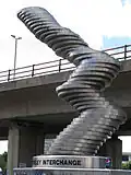 ![]() More images  |  24 hour Route | Ramps near the Bull Ring (either side of Rotunda Square)  52°28′41″N 1°53′44″W / 52.478029°N 1.895602°W  |  2004 | Anuradha Patel | Railings | Painted steel | Birmingham City Council | An important pedestrian route between Birmingham New Street railway station and Birmingham Moor Street railway station[24]