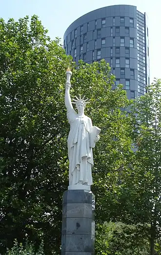 | Statue of Liberty | Upperton Road, Leicester 52°37′33″N 1°08′37″W / 52.625817°N 1.143607°W | 1922 | J H Morcom | Statue | Reinforced cement | h 5.18 metres (17.0 feet) | Formerly on Liberty Shoe Factory, Eastern Boulevard.[1]