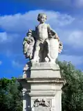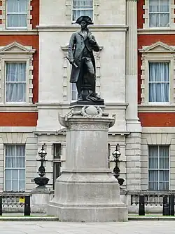 ![]() More images | Statue of George III | Cockspur Street, facing down Pall Mall 51°30′28″N 0°07′50″W / 51.5078°N 0.1305°W | c. 1836 | Matthew Cotes Wyatt | — | Equestrian statue | Grade II | Unveiled 3 August 1836 by the Duke of Cumberland. After the King's death in 1820 Wyatt designed an ambitious multi-figure monument, but there were too few subscriptions for the project to go ahead. Fund-raising recommenced in 1831. The statue came to be nicknamed "the Pigtail and Pump-head".[10] |