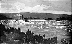 - Rock Island Rapids: Located at approximately river mile 454, near Rock Island Dam and Rock Island, and a few miles upriver from Cabinet Rapids; 47°20′39″N 120°5′52″W / 47.34417°N 120.09778°W.[34] The rapids were over 2 miles (3.2 km) long. Local native people called them Squah-ah-shee. They were given their present name in 1881 by Lieutenant Thomas W. Symons, who named them for Rock Island, a large rock in the river below Wenatchee, around which the water flowed swift and roughly.[15] The two channels around Rock Island were full of rocks and other obstructions, and there was a "great reef" a short distance above the head of the island, with large bars of gravel, "nearly choking the channel at low water". The river fell 10 feet (3.0 m) over a distance of 3,000 feet (910 m) at low-water.[32] In 1933 the rapids were submerged in Rock Island Pool, the reservoir of Rock Island Dam. At least two steamboats were wrecked at the rapids. The Selkirk wrecked at Rock Island Rapids on May 15, 1906 (see Shipwrecks of the inland Columbia River). In 1887 a steamboat tried and failed to ascend the Rock Island Rapids. In 1888 two steamboats were built at Pasco specifically for the purpose of making it through Priest Rapids and Rock Island Rapids to Wenatchee. The first of the two failed. The second, smaller one, City of Ellensburg, under Captain William Polk Gray, succeeded in passing through Priest Rapids and the more difficult Rock Island Rapids. Later, the sister boat, Thomas L. Nixon, also succeeded in ascending both rapids and reaching Wenatchee.[30]