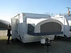 A blend between a travel trailer and a folding (tent) trailer. One type has rigid sides and pull-out tent sections (usually beds) while another type's top section of walls and its roof can be lowered over its bottom section to reduce its height for towing.