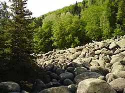 | Zlatnite Mostove | Zlatnite Mostove (The Golden Bridges) is the largest stone river in Vitosha Mountain. It is situated in the valley of Vladayska River, extending 2.2 km, and up to 150 m wide, with several ‘tributary’ stone rivers. The stone river is "descending" from an elevation of 1800 m above sea level to 1410 m. The lower reaches of the stone river is a popular tourist destination accessible from Sofia by road. The name Golden Bridges derives from the golden colour of the lichens growing on the surface of stone run boulders.[25] | ![]() |