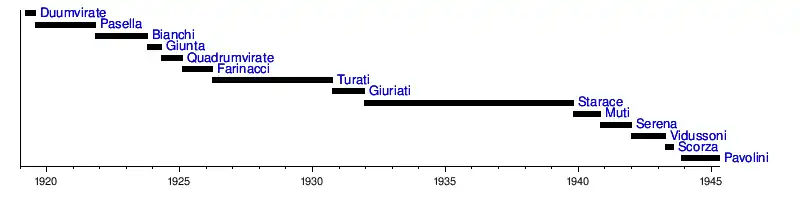 | 1 | | Duumvirate[a] | 23 March 1919 | 1 August 1919 | 131 days | Italian Fasces of Combat | [1] | |