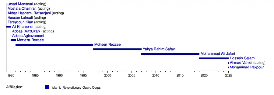 - ^ a b c d e Forozan, Hesam (2015), The Military in Post-Revolutionary Iran: The Evolution and Roles of the Revolutionary Guards, Routledge, Table 2.1: Commander-in-Chief of the Sepah Since 1979, p 59, ISBN 9781317430742