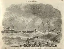 22 January List of shipwrecks: 22 January 1858 Ship State Description Auguste France The full-rigged ship was wrecked in St Francis Bay with the loss of eight of her crew. She was on a voyage from Réunion to Marseille , Bouches-du-Rhône .[ 87] [ 88] Barnabas Webb United States The ship ran aground at the mouth of the Mississippi River . She was on a voyage from New Orleans, Louisiana to Liverpool , Lancashire , United Kingdom .[ 89] Excel United Kingdom Excel The ship Excel of Weymouth, sank at Calais , France, 21–22 January. Dawson United Kingdom The ship ran aground at Grimsby , Lincolnshire . She was on a voyage from Newcastle upon Tyne , Northumberland to London .[ 70] Ellerslie United Kingdom The barque was driven ashore and wrecked near Wexford . She was on a voyage from Liverpool to Barbados .[ 41] [ 26] She was refloated on 1 February and taken in to Wexford.[ 90] Excel United Kingdom The schooner was driven ashore and wrecked at Calais , France with the loss of all but one of her crew. The ship's dog survived. She was on a voyage from Guernsey , Channel Islands to London.[ 41] [ 91] Fawn France The schooner was driven ashore at Cayeux-sur-Mer , Somme , France with the loss of a crew member. She was on a voyage from Sunderland, County Durham to Portsmouth , Hampshire .[ 92] She was condemned.[ 43] Margaret United Kingdom The sloop was driven ashore at "Barnmouth", Fife .[ 93] Normandy Flag unknown The ship ran aground at the mouth of the Mississippi River.[ 89] Santa Maria Grand Duchy of Tuscany The ship departed from Newport, Monmouthshire , United Kingdom for Livorno . No further trace, presumed foundered with the loss of all hands.[ 94] Seaman' s Bride United States The ship ran aground at the mouth of the Mississippi River.[ 89] W. H. Prescott United States The ship ran aground at the mouth of the Mississippi River. She was on a voyage from New Orleans to Liverpool.[ 89]