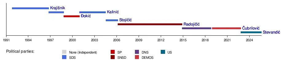| 7 | | Nenad Stevandić Ненад Стевандић (born 1966) | 15 November 2022 – Incumbent | 2 years, 276 days | United Srpska | |