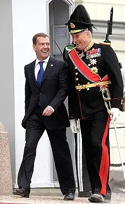 Below is a complete list of state visits made and received by Harald V of Norway. Four state visits are usually made each year: two visits by King Harald and Queen Sonja to a foreign head of state and two visits by another head of state to Norway. The number of state visits has increased greatly during the 1900s. King Haakon VII reigned for 52 years from 1905 and made a total of 13 state visits to foreign countries. King Harald V had as of 2016 reigned for 25 years and had conducted 45 state visits. Today a state visit is accompanied by large trade delegations and is seen as an important venue to promote trade and other business relations as well as cultural and political ties between the two countries.
