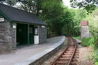 Above Brynglas, the line enters woodlands west of Dolgoch, climbing steadily, then curves to the south east and crosses the Dolgoch gorge on the Dolgoch viaduct.[10] Dolgoch station is immediately east of the viaduct, situated on a left-hand curve at 187 ft (57 m) above sea level, and is the main intermediate station on the line, being popular with tourists visiting the nearby falls. The railway continues in a north easterly direction, passing Quarry Siding, where a halt and passing loop are located. The line continues its ascent towards Abergynolwyn station, situated on a ledge cut into the hillside.[11] This was the original terminus of the statutory railway, beyond which the railway continued as a mineral extension, now converted for passenger use. About three quarters of the way along the 0.75 miles (1.21 km) extension is the site of the Village Incline. From here the line runs into a gorge, high above the river on a narrow ledge, ending at the foot of the first incline leading to the Bryn Eglwys quarry. Nant Gwernol station, the eastern terminus of the line, was built here on the site of a set of three sidings which originally marked the end of the original line.[12]