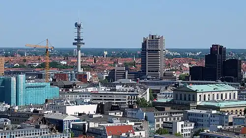 Most of the high-rise buildings are concentrated in two smaller clusters. One is located in the center of Hanover, along Hamburger Allee and Raschplatz and near the main train station with Telemoritz, Lister Tor, Sparkasse Hannover, IntercityHotel and Hamburger Allee 25. The other cluster is the Ihme-Zentrum with Stadtwerke-Hochhaus, Ihmepassage 2, Ihmeplatz 1 and other residential high-rise buildings.[2]