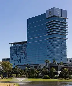 High-rise development entered into a slowdown in the late 1970s and continued until the mid-1980s, potentially affected by the 1973–1975 recession.[12] Construction resumed in the late 1980s with the completion of three of Perth's tallest buildings at the time. The first was 108 St Georges Terrace (opening as Bond Tower or R&I Tower, as both logos were on the building's exterior at the time). Completed in 1988, the tower's prime location was the site of the first licensed premises in Perth from the 1830s.[13] The skyscraper preserves the 1897 Palace Hotel at its base. A public campaign, with a group known as The Palace Guards, had opposed the demolution of the Palace Hotel after initial plans for the site were made in 1972.[14] The skyscraper's design is known for its triangular shape and diagonal roof.[15]