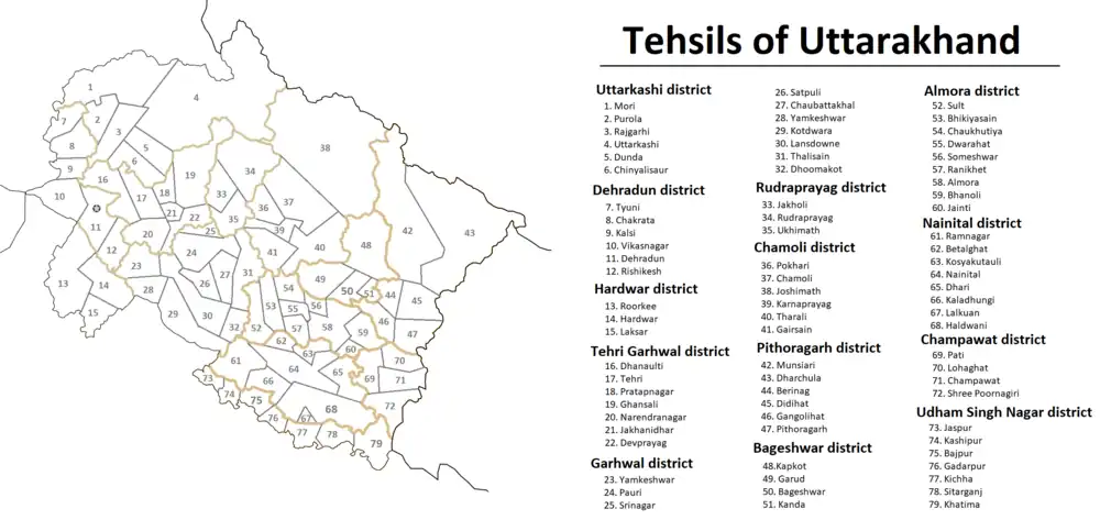 The article lists all the 113 tehsils in the 13 districts of Uttarakhand.