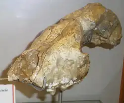 • Mounted fossilized skeleton of the Miocene elephant relative Platybelodon