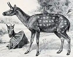 Life restoration of the Miocene deer relative Subdromomeryx. Robert Bruce Horsfall (1913). - †Subdromomeryx antilopinus – or unidentified related form