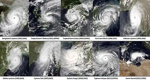 20th century Name Dates active Basin Areas affected Deaths Refs ? "Hong Kong" September 7–18, 1906 Western Pacific China 15,000 [ 1] 3 "Monterrey " August 20–28, 1909 North Atlantic Greater Antilles, Mexico 4,000 ? Unnamed April 1911 North Indian Ocean Bangladesh 120,000 [ 12] ? "China" August 1912 Western Pacific China 50,000 [ 13] ? Unnamed September 1912 Western Pacific Japan 1,000 [ 14] ? Unnamed May 1917 North Indian Ocean Bangladesh 70,000 [ 12] ? Unnamed September 1919 Western Pacific Japan 4,000 [ 14] ? Unnamed September 1919 North Indian Ocean Bangladesh 40,000 [ 12] ? "Shantou" July 27 – August 3, 1922 Western Pacific China 60,000 [ 13] ? Unnamed September 1923 Western Pacific Japan 3,000 [ 14] ? Unnamed May 1926 North Indian Ocean India 5,000 [ 5] ? Unnamed July 20–27, 1927 Western Pacific China 10,000 [ 15] ? Unnamed August 19–30, 1927 Western Pacific China 5,000 [ 16] ? Unnamed September 26, 1927 Western Pacific China 5,000 [ 17] 5 "Okeechobee" September 6–20, 1928 North Atlantic Lesser Antilles, Puerto Rico, Florida 4,075 4 "San Zenon" August 29 – September 17, 1930 North Atlantic Lesser Antilles, Hispaniola 2,000–8,000 [ 3] ? "Shanghai" August 14–28, 1931 Western Pacific China 300,000 [ 18] [ 19] [ 20] 4 "British Honduras" September 6–13, 1931 North Atlantic British Honduras 1,500–2,500 [ 3] 5 "Cuba" October 30 – November 13, 1932 North Atlantic Netherlands Antilles, Cuba, Bahamas 3,142 [ 21] [ 22] 2 "Central America" June 4–18, 1934 North Atlantic Central America, Eastern United States 2,000–3,000 ? "Muroto" September 13–21, 1934 Western Pacific Japan 3,066 [ 23] 1 "Jérémie" October 18–27, 1935 North Atlantic Greater Antilles, Central America 2,150 ? Unnamed August 28, 1936 Western Pacific South Korea 1,104 [ 24] ? "Hong Kong" August 28 – September 4, 1937 Western Pacific China 13,000 [ 1] ? Unnamed May 21–27, 1941 North Indian Ocean Bangladesh 7,500 [ 5] ? Unnamed October 16, 1943 North Indian Ocean India 15,000 [ 5] 1 Ida September 10–20, 1945 Western Pacific Japan 2,473 [ 25] 2 Kathleen September 10–17, 1947 Western Pacific Japan 1,077 [ 26] ? Unnamed May 17–19, 1948 North Indian Ocean Bangladesh 1,200 [ 2] 4 Trix October 15–26, 1952 Western Pacific Philippines, Vietnam 1,400 [ 27] [ 28] 1 Marie September 19–28, 1954 Western Pacific Japan 1,761 [ 29] 5 Janet September 21–30, 1955 North Atlantic Barbados, Windward Islands, British Honduras, Yucatán Peninsula, Mainland Mexico 1,023 5 Wanda July 25 – August 5, 1956 Western Pacific Taiwan, China 4,935 [ 30] 5 Ida September 20–27, 1958 Western Pacific Japan 1,269 [ 29] ? Unnamed October 21–24, 1958 North Indian Ocean Bangladesh 12,000 [ 12] 5 Sarah September 11–19, 1959 Western Pacific Japan, South Korea 2,000 [ 31] 5 Vera September 20–27, 1959 Western Pacific Japan 5,000 [ 32] 4 "Mexico" October 22–28, 1959 Eastern Pacific Southwest Mexico 1,800 [ 33] 1 Mary June 2–12, 1960 Western Pacific China 1,600 [ 34] 2 Nine October 5–12, 1960 North Indian Ocean Bangladesh 6,000 [ 12] 3 Ten October 27 – November 1, 1960 North Indian Ocean Bangladesh 8,149 [ 12] 2 Three May 5–9, 1961 North Indian Ocean Bangladesh 11,468 [ 12] ? Five May 27–30, 1961 North Indian Ocean Bangladesh 10,466 [ 2] 1 Harriet October 19–31, 1962 Western Pacific and North Indian Ocean Bangladesh, Thailand 50,935 [ 35] [ 12] 1 Three May 25–29, 1963 North Indian Ocean Bangladesh 11,520 [ 12] 4 Flora September 26 – October 12, 1963 North Atlantic The Caribbean, Florida 7,193 [ 36] 5 "Rameswaram" December 18–24, 1964 North Indian Ocean Sri Lanka, India 1,800 [ 37] 1 One May 9–12, 1965 North Indian Ocean Bangladesh 19,270 [ 12] 1 Two May 26 – June 1, 1965 North Indian Ocean Bangladesh 12,000 [ 12] 1 Thirteen December 5–15, 1965 North Indian Ocean Pakistan 10,000 [ 38] 5 Inez September 21 – October 11, 1966 North Atlantic Lesser Antilles, Haiti, Cuba, Bahamas, Florida Keys, Yucatán, Mexico 1,000 – 1,269 [ 39] 1 "Burma" May 7–10, 1968 North Indian Ocean Myanmar 1,037 [ 40] 4 "Bhola" November 3–13, 1970 North Indian Ocean Bangladesh, India ≥300,000 [ 41] [ 10] [ 42] 3 "Odisha" October 27–31, 1971 North Indian Ocean Bangladesh, India 11,000 [ 12] 3 "Flores" April 26–30, 1973 Australian Indonesia 1,653 [ 43] 2 Fifi-Orlene September 14–24, 1974 North Atlantic Jamaica, Central America, Mexico 8,210 [ 44] [ 3] 4 Nina July 30 – August 8, 1975 Western Pacific Ocean China 26,000 [ 41] 4 Liza September 25 – October 2, 1976 Eastern Pacific Mexico, Southwestern United States 1,263 3 "Andhra Pradesh" November 14–21, 1977 North Indian Ocean India (especially Andhra Pradesh ) 10,000 [ 45] 2 "Sri Lanka" November 17–29, 1978 North Indian Ocean Sri Lanka, India 1,000 [ 46] 5 David August 25 – September 8, 1979 North Atlantic The Caribbean, Eastern United States 2,068 [ 47] [ 48] 2 Paul September 18–30, 1982 Eastern Pacific Central America, Mexico 1,800 4 Ike August 26 – September 6, 1984 Western Pacific Philippines, China 1,474 [ 49] [ 50] [ 51] 4 Agnes October 30 – November 9, 1984 Western Pacific Philippines, Vietnam 1,029 [ 52] [ 53] TS "Bangladesh" May 22–25, 1985 North Indian Ocean Bangladesh 11,069 [ 12] 3 "Bangladesh" November 21–30, 1988 North Indian Ocean Bangladesh, India 6,240 [ 54] [ 55] 5 "Bangladesh" April 24–30, 1991 North Indian Ocean Bangladesh 138,000 [ 56] TS Thelma November 1–8, 1991 Western Pacific Philippines 5,081 [ 57] 4 Fred August 14–22, 1994 Western Pacific Japan, Taiwan, China 1,248 [ 58] 1 Gordon November 8–21, 1994 North Atlantic Central America, Greater Antilles, Florida 1,152 4 "Andhra Pradesh" November 4–7, 1996 North Indian Ocean India 1,077 [ 59] TS Linda October 31 – November 9, 1997 Western Pacific and North Indian Ocean Philippines, Vietnam, Thailand 3,275 [ 60] [ 61] [ 62] 3 "Gujarat" June 4–10, 1998 North Indian Ocean India 1,173 [ 63] 5 Mitch October 22 – November 5, 1998 North Atlantic Central America, Yucat
