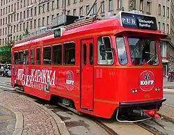 ![]() | SpåraKoff tram bar | 1995 | SpåraKoff is a HM V type tram converted into a bar in Helsinki. Known as the pub tram, the vehicle does circular tours of downtown Helsinki picking up passengers for a fee during summer months. It is operated jointly by Sinebrychoff, HOK-Elanto (part of the S Group), and Helsinki City Transport.[1] A tour ("pub crawl") takes approximately 40 minutes, travelling from the Helsinki Railway Square to Kallio, Töölö, and the Market Square, while its passengers enjoy their drinks.[2] In addition to scheduled public rounds, the tram conducts 2-hour-long reserved rounds, for private events and public outings. |