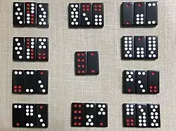 A Chinese domino set is composed of every combination of outcomes possible from throwing two six-sided dice, which there are 21 of. These combinations are split across two suits: civil and military. Each civil tile has a unique rank, meanwhile most military tiles share a rank with another tile. The eleven civil suit tiles, from Highest to lowest are: 6-6, 1-1, 4-4, 1-3, 5-5, 3-3, 2-2, 5-6, 4-6, 1-6, 1-5. The ten military suit tiles, from highest to lowest are: 3-6 and 4-5; 2-6 and 3-5; 2-5 and 3-4; 2-4; 1-4 and 2-3; 1-2. The Civil suit is duplicated, bringing the size of the set to 32 dominoes. Note that there are variants to this standard format.