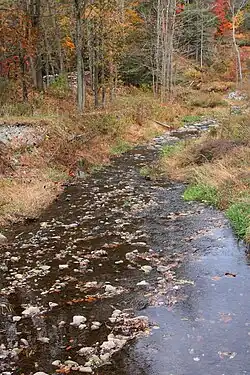 Bowman Creek's main stem is designated as a High-Quality Coldwater Fishery and the watersheds of all but two of its tributaries have the same designation.[4] The watersheds of the remaining two tributaries, Sorber Run and Cider Run, are designated as Exceptional Value waters, with standards even higher than those of High-Quality Coldwater Fisheries.[4][5] Additionally, these two tributaries are the only Wilderness Trout Streams in Wyoming County.[6] Wild trout naturally reproduce throughout all of the creek's tributaries.[7] A total of ten named streams in the watershed of Bowman Creek are classified by the Pennsylvania Fish and Boat Commission as Class A Wild Trout Waters.[8] Most hold this designation for brook trout only, but Sugar Hollow Creek and a section of Roaring Run hold the designation for rainbow trout, either instead of or in addition to brook trout.[8]