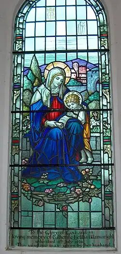 | St Michael and All Angels Church | Bedminster, Bristol | In left hand light of Robinson's window for this church, Jesus is shown blessing a child and below is the inscription "He went throughout every city and village preaching and showing the glad tidings of the Kingdom of God". The central panel shows the Blessed Virgin Mary with Jesus on her lap.[4] | ||