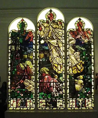 The Birmingham Art Gallery Birmingham, Warwickshire have a Payne window which came from a Methodist chapel in Cradley Heath. It was executed in 1922 and served as a War Memorial for the men of the chapel's congregation who gave their lives in the First World War. The work was entitled "Peace and Goodwill".[1] In Payne's composition angels appear to the shepherds to announce the Birth of Jesus. The title is part of the words "Glory to God in the highest, and on earth peace, good will toward men". There are three vignettes at the base of the window which depict the Annunciation, the Nativity and the Crucifixion. The window was designed and made by Payne at his studio in the Cotswolds.