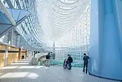 The Hall is a marvel of engineering whose 197-foot-high curtain wall of laminated glass would seem to tempt fate in an island nation whose collective memory is haunted by catastrophic earthquakes. Not so: though "extremely light and flexible", the Glass Hall's structural system is designed to withstand "extreme seismic forces" (Rafael Viñoly).