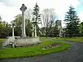 | Altrincham and Dunham Massey war memorial 53°23′10″N 2°21′46″W / 53.38608°N 2.36279°W | ![]() | 1920 | The war memorial is in Portland stone, and consists of a Celtic cross on a stepped plinth on a wide octagonal dais. The dais has a surrounding wall and two flights of steps with ramped balustrades leading up to it. On the inner face of the wall are seats, and there are two lanterns on slender shafts. On the wall are bronze plaques listing those lost in the World Wars. There is carved interlace decoration on the faces of the cross shaft, and at its foot are two inscribed bronze plaques.[28][60] | II |