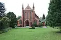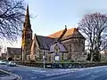| Church of St Vincent de Paul and presbytery 53°23′11″N 2°21′22″W / 53.38636°N 2.35609°W | ![]() | 1904–05 | A Roman Catholic church designed by Edmund Kirby in Early English style, it is in Ruabon brick with terracotta dressings, and has a slate roof. The church consists of a nave with a clerestory, north and south aisles, a west porch, north and south transepts, and a chancel with a polygonal apse. The presbytery is attached to the south corner, it is in similar materials, and has two storeys, a hipped roof, sash windows, a Tudor arched doorway, and decoration in diapering.[39][55] | II |