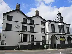 | Old Market Tavern 53°23′22″N 2°21′02″W / 53.38934°N 2.35042°W | Early 19th century | Originally the Unicorn Hotel, the Town Hall was added to the right in 1849, and when this closed it was incorporated into the hotel, later a public house. The building is in brick, mainly rendered, on a stone plinth, with stone dressings and slate roofs. The hotel has three storeys, three bays on the east front, three on the south front, and a two-storey, three-bay rear wing. On the east front is a porch with Tuscan columns, and two gables with pierced bargeboards. The former town hall projects slightly, it has two storeys, three bays, and a hipped roof. On the front is a rusticated ground floor, a carriage entry, and two semicircular-headed windows. On the upper floor is an oriel window above which is a clock tower with a bellcote and a weathervane.[17][18] | II | |