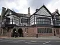 | Bank House 53°23′20″N 2°21′03″W / 53.38887°N 2.35089°W | 1875 | Originally Brooke's Bank, it curves around a corner, and has a sandstone ground floor with timber framing above, and a clay tile roof. There are two storeys with attics, four bays, and three unequal gables with bressumers, decorative bargeboards and finials. In the second bay is a double-arched entrance with a balustrade and a balcony above. The first and fourth bays have mullioned and transomed windows on the ground floor and oriel windows on the upper floors and attics. The third bay contains a large two-storey curved bay window with eleven lights. On the roof are Tudor-style chimney stacks and a lead bellcote.[17][43] | II | |