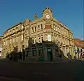 | Co-op Jewellers 53°33′02″N 1°28′49″W / 53.55056°N 1.48028°W | ![]() | 1885 | The shop, on a corner site, is in stone, with a lettered frieze between the top two floors, a moulded cornice and parapet, and a Welsh slate roof. There are three storeys, four bays on Wellington Street, seven on Market Street, and a bay on the corner. The entrance in the corner bay, and above it is a two-storey circular oriel window surmounted by a conical spire and an iron crest. The windows either have a single light, or are mullioned and transomed. On each front, one bay projects and has a blind pedimented dormer and ball finials. The right bay on Market Street contains a cart entry and, apart from this and the entrance, the ground floor is covered by applied materials.[46] | II |