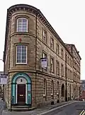 | HSBC Bank 53°41′31″N 1°37′46″W / 53.69195°N 1.62935°W | ![]() | 1857–59 | The bank, which is in Italianate style, is in stone, the lower two storeys rusticated, with a moulded eaves cornice on paired consoles, a balustraded parapet with urns and dies, and a hipped pantile roof. There are three storeys and four bays, the bays are separated by rusticated pilasters, there is an entablature on each floor, and each bay contains two windows. In the outer bays are doorways, the left one with a segmental pediment on decorative consoles. The ground floor windows have segmental heads, and all the openings on the ground floor have elongated keystones. The windows in the middle floor have round heads and spandrels carved with foliage and human and rams' heads, and the top floor windows have segmental heads.[62][95] | II |