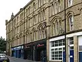 | 26 Bond Street and 9, 11 and 13 Wellington Road East 53°41′32″N 1°37′54″W / 53.69216°N 1.63169°W | ![]() | c. 1800 | A group of offices and warehouses in stone with slate roofs, with additions into later in the 19th century. No. 11 Wellington Road is an office with three storeys and two bays. To the left and at an angle is a warehouse with three storeys and three bays, the middle bay containing loading doors, and a Diocletian window in a gable above. To the right is a long range along Wellington Road with four storeys and nine bays. On its right is a curved corner bay, and in Bond Street are blocks of five and four bays, the latter containing a cart entrance.[47] | II |