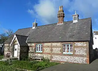 As well as St Mary the Virgin's Church, the Lamb Inn, Bourne's old manor house and several cottages, some former agricultural buildings and farmhouses—mostly now converted for other uses—survive from the pre-resort era. Flint, cobblestones and red brick are the characteristic building materials of these simple Vernacular structures. Examples include Pillory Barn,[10] Upperton Farmhouse,[11] and the farmhouse,[12] barn[13] and dovecote[14] of Motcombe Farm. A large group of similar buildings of the 18th and 19th centuries are found in Willingdon, a Downland village which has become part of the Eastbourne conurbation and whose southern section is part of the borough. Several flint-built cottages surround the village post office and stretch down Wish Hill. Nearby, Chalk Farm and its barn have been converted into a hotel and restaurant.[15][16]