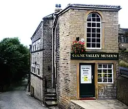 | Factory adjacent to Bankfield 53°38′04″N 1°50′50″W / 53.63457°N 1.84724°W | ![]() | Early 19th century | A former weaving factory in stone with stone gutter brackets, and a stone slate roof with a coped gable on the west. There are three storeys and a basement on the south. The windows are mullioned, including a 13-light window on the south front, where the doorway is approached by stone steps with railings. In the west gable end is a loading door on each floor.[60] | II |