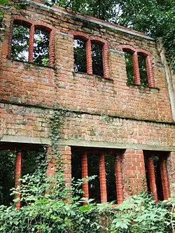 | Lydiate Hall 53°32′20″N 2°57′47″W / 53.53884°N 2.96319°W | 15th century | Once a country house in a courtyard plan, with three sides timber-framed and one side in stone, only ruins remain. These are in brick and stone, with part of a slate roof. The remains include the foundations, standing walls with mullioned windows, chimney stacks, and a Tudor-headed fireplace.[5][6] | II | |