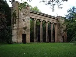 | Colonnade 53°31′44″N 2°15′27″W / 53.52885°N 2.25752°W | ![]() | c. 1822–24 | The colonnade was designed by Francis Goodwin. It was originally the portico at the front of the previous Manchester Town Hall, and was moved to its present site by the lake to the south of Heaton Hall in 1912. It is in sandstone, and consists of four giant fluted Ionic columns with an entablature containing an egg-and-dart string course, a cornice, and a parapet. The columns are flanked by single-bay screen walls that have pilasters and a frieze with palmette decoration, a doorway, and a coved niche with a statue.[10][12] | II* |