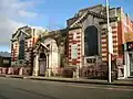 | Jewish Museum 53°29′44″N 2°14′17″W / 53.49568°N 2.23805°W  |  ![]()  |  1889 | Originally a synagogue designed by Edward Salomons, and later converted into a museum, it is in red brick on a plinth, with sandstone dressings, an ornamental band, and a slate roof. It has a T-shaped plan, with the main body at right angles to the street, and wings flanking at the front. The front is symmetrical, with two storeys and three bays. In the centre is a round-arched doorway with shafts, a banded lintel, and polychrome voussoirs. Above it is an arcaded five-light window, a cinquefoil motif, and a gable with dentilled coping and a finial. The outer bays have gables at the sides with finials. Along the sides are segmental-headed windows on the ground floor, and circular windows above.[21][22] | II* |