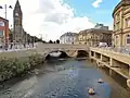 | Rochdale Bridge 53°37′01″N 2°09′29″W / 53.61683°N 2.15811°W | ![]() | Medieval | The bridge, which carries a road over the River Roch, was extended to the east in 1667, there were further extensions to both sides in the 18th century, and to the east in 1821, and it was restored in 2015–16. The bridge is in sandstone, the medieval part has two semicircular arches and a central pointed arch, the 18th-century extension has three semicircular arches with pilasters and cutwaters, and the 1821 extension has three flattened segmental arches.[4] | II |