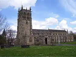 | St Chad's Church 53°36′53″N 2°09′28″W / 53.61477°N 2.15775°W | 13th century | The oldest part of the church is the lower part of the tower, and most of the body of the church dates from the 14th–16th centuries. In 1854–55 Joseph Clarke rebuilt the nave roof and the north aisle, in 1873 W. H. Crossland added the porch and the top stage of the tower, with gargoyles carved by Thomas Earp, and 1884–85 the chancel was rebuilt and extended by J. S. Crowther, again with carvings by Earp. The older parts of the church are in gritstone, the later work is in sandstone, and the roof is in slate and copper. The church consists of a nave with a clerestory, north and south aisles, a south porch, a chancel with north and south chapels, and a west tower. The tower has three stages, angle buttresss, and an embattled parapet with crocketed pinnacles. The parapets of the body of the church are also embattled and have crocketed pinnacles.[2][3] | II* | |