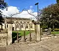 | Falinge Park Hall façade and pavilions 53°37′25″N 2°09′54″W / 53.62360°N 2.16500°W | — | Late 18th century | All that remains of a country house are its façade, one bay of each side wall, flanking pavilions, and passages joining them to the side walls, all in ashlar stone. The façade has a plinth, bands, a modillion cornice, a parapet, and a pediment with a floral cartouche in relief. There are two storeys and five bays, the middle three bays projecting under a pediment, and a central Ionic porch with two detached columns, four pilasters, an entablature, and a fanlight. The linking passages have three bays, the central bay containing a door with an architrave, and the outer bays with arched recesses. The pavilions each has a three-light window with Doric pilasters, an elliptical tympanum, a cornice, a parapet, and a hipped roof.[12][44] | II |