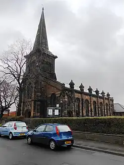 | Highfield United Reformed Church 53°22′02″N 3°00′34″W / 53.36724°N 3.00942°W | 1870–71 | Originally a Congregational church by David Walker, it is built in Storeton stone with Welsh slate roofs. The church consists of a nave, aisles, shallow transepts, and a southwest steeple. The steeple has a tower, a broach spire and the bases of angle pinnacles, and the windows contain Decorated tracery. To the east of the church is a complex of hall and vestries.[4][38] | |