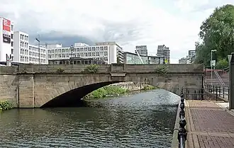 | Blackfriars Bridge 53°29′02″N 2°14′52″W / 53.48383°N 2.24790°W | ![]() | c. 1820 | The bridge carries Blackfriars Street on a slope over the River Irwell. It is in stone and cast iron, and consists of three semicircular arches, partly embedded in the river bank. On each side of the central arch are paired Ionic pilasters, the voussoirs have vermiculated rustication, and the outer faces of the parapets are balustraded.[14] | II |