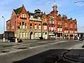 | Arlington House 53°29′04″N 2°15′21″W / 53.48437°N 2.25591°W | ![]() | 1880 | Originally the offices for the Gas Board, it is in red brick on a stone plinth, with a corbelled eaves cornice and a steep Welsh slate roof. The building has two storeys with attics, and a symmetrical front of nine bays. The central bay contains a doorway with a semicircular head and engaged granite pilasters with foliated capitals. Above the doorway is an oriel window with a parapet and gargoyles. The bay rises to a tower with a machicolated parapet, bartizans, and a truncated pyramidal roof with iron brattishing. The outer bays project and have pyramidal roofs, and on the roof are gabled dormers.[115][116] | II |