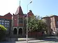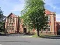 | Wallasey Central Library, including former Earlston House 53°25′44″N 3°02′44″W / 53.42892°N 3.04542°W | 1911 | The library incorporates a house dating from about 1840. The library is in red Ruabon brick and buff terracotta on a steel frame, with a green slate roof, and is in Edwardian Baroque style, and the house is in buff sandstone in Scottish Tudor Gothic style with blue slate roof. The library has a T-shaped plan, with a two-storey range facing the road and a single-storey wing to the south. The house is attached to the library, and has an L-shaped plan, and a three-storey round tower in the angle. The main front has three wide bays, with the entrance in the middle bay, which has an elaborate surround and a segmental open pediment. The outer bays project under an open pediment, and contain a Venetian window in the upper floor.[39][40] | II | |