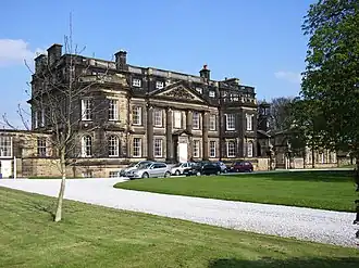 | The Dower House 53°40′34″N 1°27′43″W / 53.67609°N 1.46206°W | ![]() | c.1740 | The house, which was extended in the 19th century, is in stone on a chamfered plinth, with rusticated quoins, a moulded band, a moulded eaves cornice, and a hipped roof in Westmorland green slate. There are two storeys, fronts of five and four bays, and an added projecting bay on the left. The middle three bays project under a triangular pediment, and the central doorway has an architrave, a five-light fanlight, a pulvinated frieze, and a moulded cornice on carved consoles. The windows are sashes with architraves. At the rear is a central arched stair window with a keystone.[9][31] | II* |