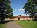 | Wiseton Stables 53°24′04″N 0°55′25″W / 53.40122°N 0.92371°W | ![]() | 1899 | The stable block of Wiseton Hall is in brick with stone dressings, floor bands, dentilled eaves and roofs in pantile and lead. There are two storeys and a closed courtyard plan with ranges of 20 bays. The central projecting gatehouse has a round arch and banded rustication, above which is a stage with coped ramps containing a clock face with keystones. Over this is a pyramidal roof, on which is a bellcote with balusters and a lead tent roof with two finials. The flanking walls contain ventilators with rubbed brick heads, and mullioned and transomed windows. Elsewhere, there are stables, a carriage house and a groom's house.[2][17] |