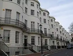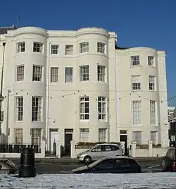 | 1-14 Park Crescent | Worthing 50°48′51″N 0°22′43″W / 50.8141°N 0.3785°W | II* | Amon Henry Wilds built this terrace of three-storey Regency-style stuccoed houses in 1829–30. The substantially curved block has ornate details such as anthemion-topped pilasters, Corinthian capitals, entablatures and balconies. Financial problems delayed its completion, and it was less successful than similar developments by Wilds in Brighton. | 432845 | [9][16] [44][54] [55][56] |