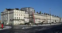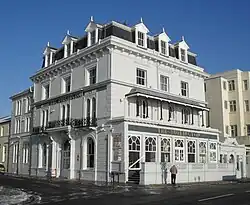 One of Worthing's earliest and most important hotels was Warne's Hotel. It was built as a five-house block called York Terrace in the 1820s, reputedly by John Rebecca. It was listed at Grade II on 11 October 1949.[22] In the 1870s, the hotel was enlarged when an adjacent terrace of houses was taken over. This was listed separately, also at Grade II, on 21 May 1976.[23] The hotel closed in 1985, and efforts to conserve it were thwarted when it was gutted by fire in 1987. Both parts of the building were demolished in 1992.[24] The 1870s corner block was delisted (removed from the statutory list) on 19 October 1998,[23] but the main block has not been officially delisted.[22]