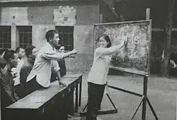 At the beginning of the literacy movement, schools were temporary, teachers were amateur, there was no uniform regulation of teaching materials and various "literacy books" were published in multiple places. Some of these "literacy books" were aimed at workers, others at peasants, and still others at urban housewives. Textbooks vary in content depending on the group they are aimed at. "Literacy textbook" mainly consists of text, new words, after class exercise three parts. Ideological and political education, such as supporting the CCP, loving the motherland, anti-feudalism, and loving one's job and dedication, is also necessary content in the textbook.[14] Various types of literacy competitions were held in the course of learning. The People's Liberation Army (PLA) held in Beijing in August 1952 to celebrate the 25th anniversary of the army, even set up a "literacy race" (write the required characters on the ground to start) and "cultural test" items. Rural literacy competitions are more common; some students write on the walls of their homes, doors, and work tools and compete to be "active" in literacy.[15]